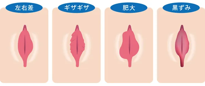 小陰唇の形状には個人差があり、通常に比べ大きめだったり、逆に小さすぎたり、左右の長さが違ったりすることもあります。