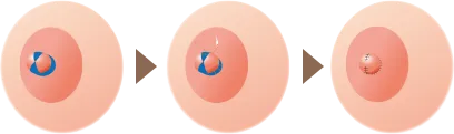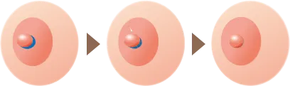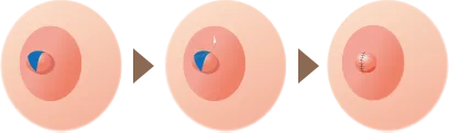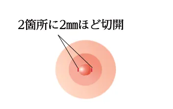 局所麻酔を行ったあと、陥没した乳頭の根本両サイドに2箇所、約2㎜切開し乳頭を突出させます。ダウンタイムをすぎると傷跡は乳輪に隠れて目立ちにくくなります。
