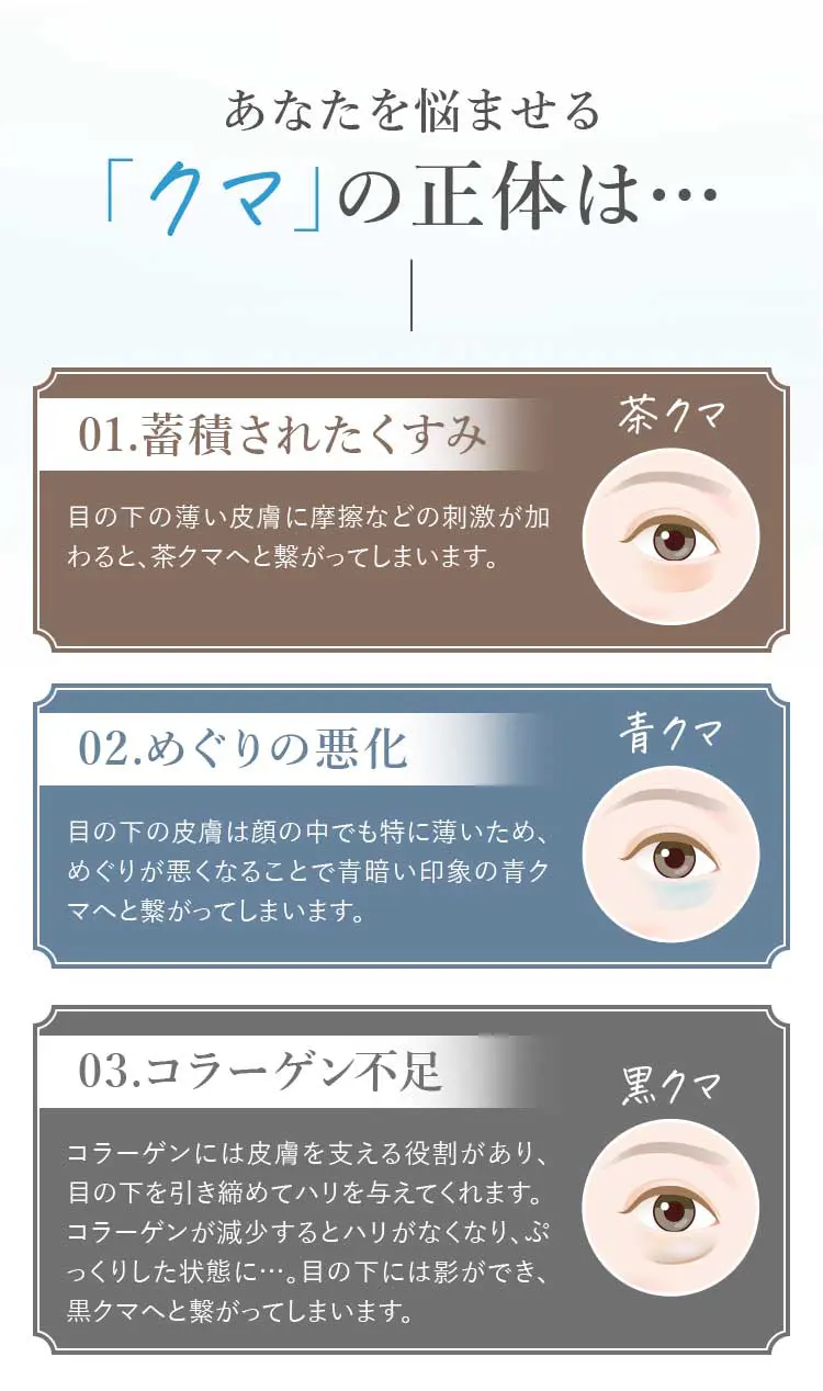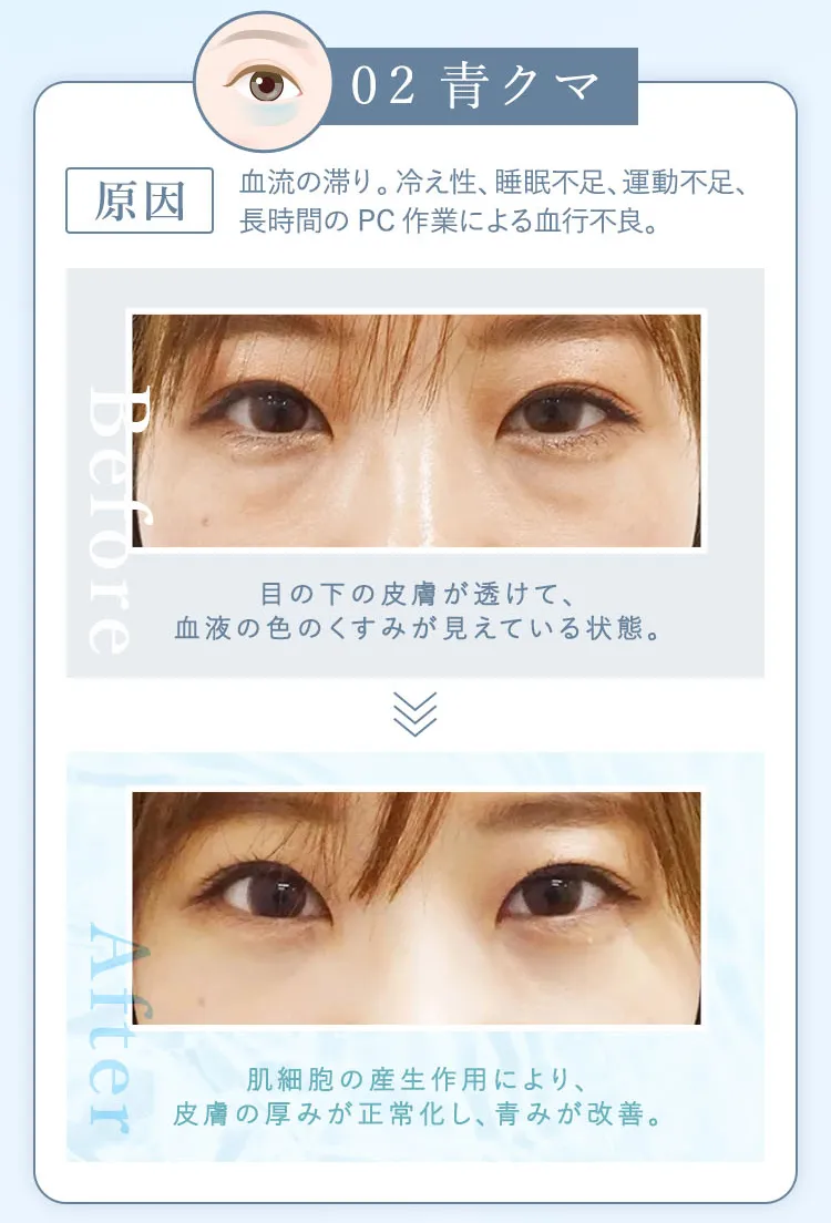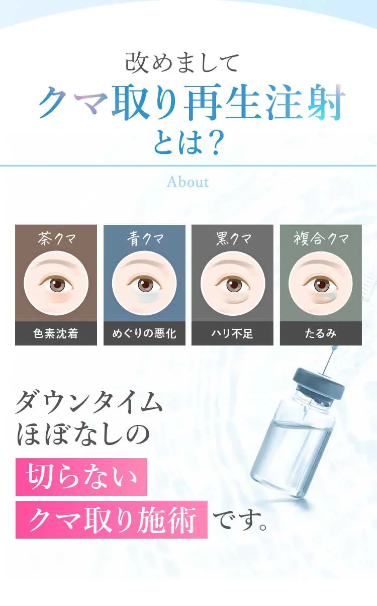 クマ取り再生注射:9,800円(税込)1回の注射で脂肪溶解、再生因子、ヒアルロン酸成分を注入し、目の下のクマを改善します。